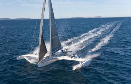 Alain Thébault et son équipe ont battu l’automne dernier deux records mondiaux absolus de vitesse, homologués par le World Sailing Speed Record Council: 51,36 noeuds de moyenne sur 500m (95km/h) et 48,74noeuds en moyenne sur un mille nautique (90km/h), à bord de son hydroptère.